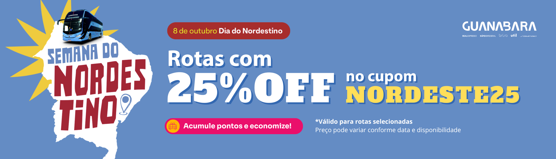Regras do cupom: Válido para compras de 08/10 a 14/10/2025 com o cupom NORDESTE25 (25% OFF). Viagens entre 15/10 e 31/10/2025, em todos os trechos e serviços Leito e Cama. Sujeito à disponibilidade e não cumulativo com outras promoções. Válido somente para o site e aplicativo oficial Viaje Guanabara.