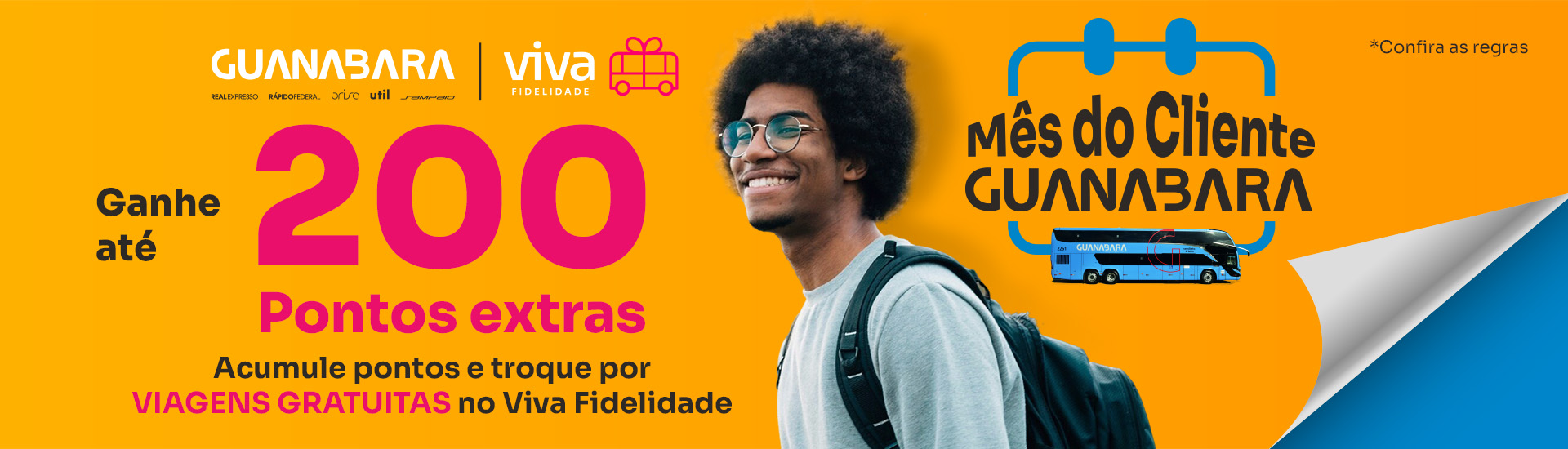 Acumule 2,5 pontos a cada R$1. Viajar com economia nunca foi tão fácil. Com o Viva Fidelidade você transforma cada passagem comprada na rodoviária, no site ou no App Viaje Guanabara em pontos que podem ser trocados por descontos incríveis. Informe seu CPF no momento da compra e acumule pontos!