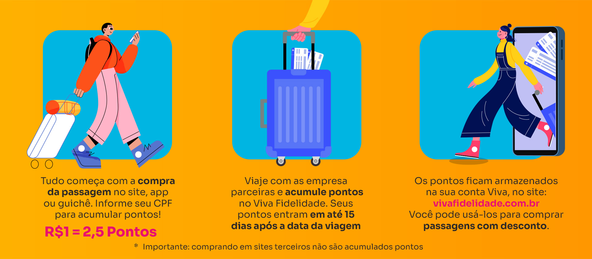 Clientes já cadastrados (antes de 01/09/2025) recebem pontos extras na primeira compra do mês para viagens de 01/09/2025 até 30/09/2025, conforme o canal de compra. Os pontos serão creditados entre 01/10/2025 e 05/10/2025, apenas para viagens realizadas (canceladas ou trocadas não recebem pontuação). No Viva Fidelidade, os pontos são sempre acumulados pelo passageiro que viaja, e não por quem compra a passagem.